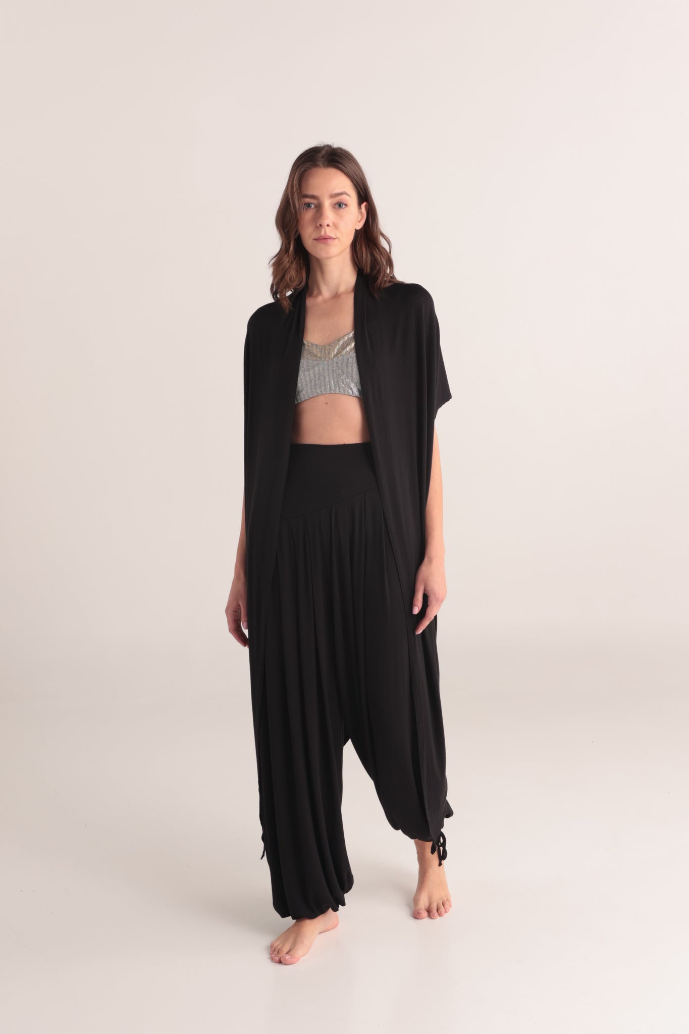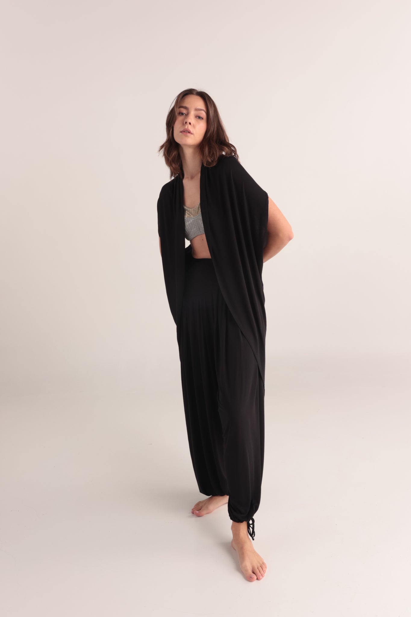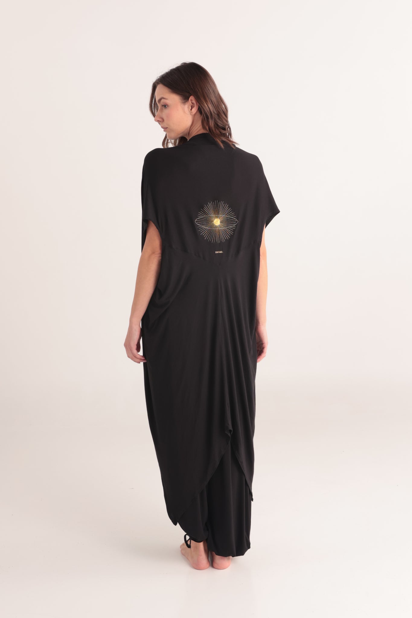 Esta es nuestra capa clásica, ahora  con un bordado de una estrella en expansión , que busca recordarnos que somos polvo de estrellas , somos luz en expasión.Es ideal para usar encima de nuestros tops y shirts , añadiendo sofisticación a tu look.         Color: Negro  Composicion: rayon - Spandex .