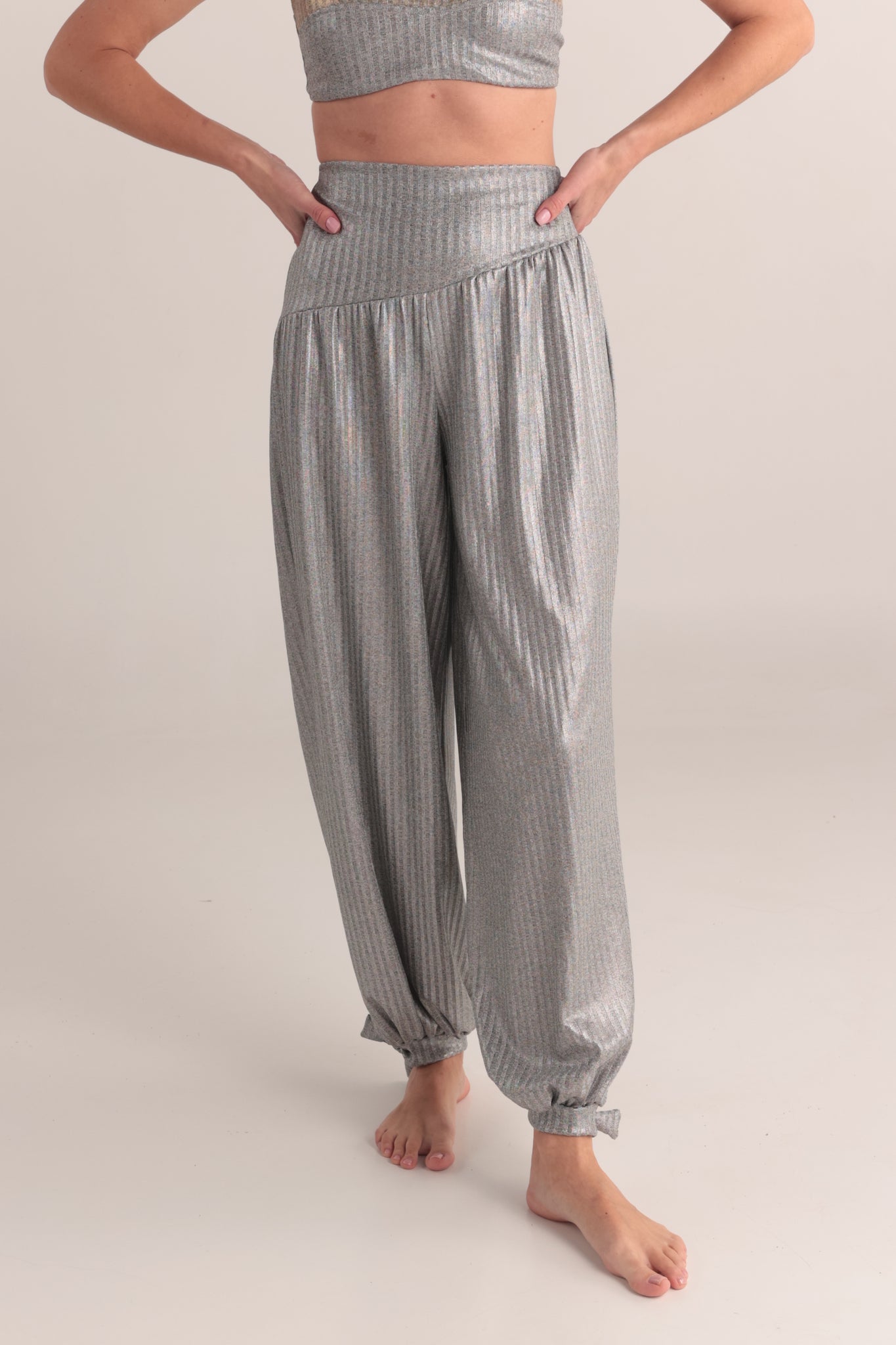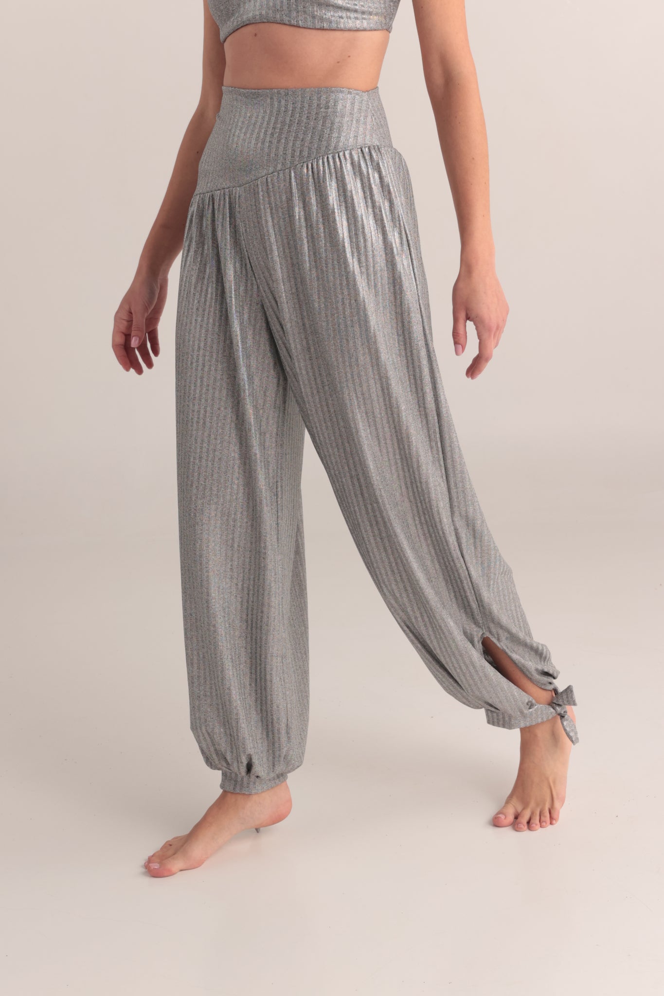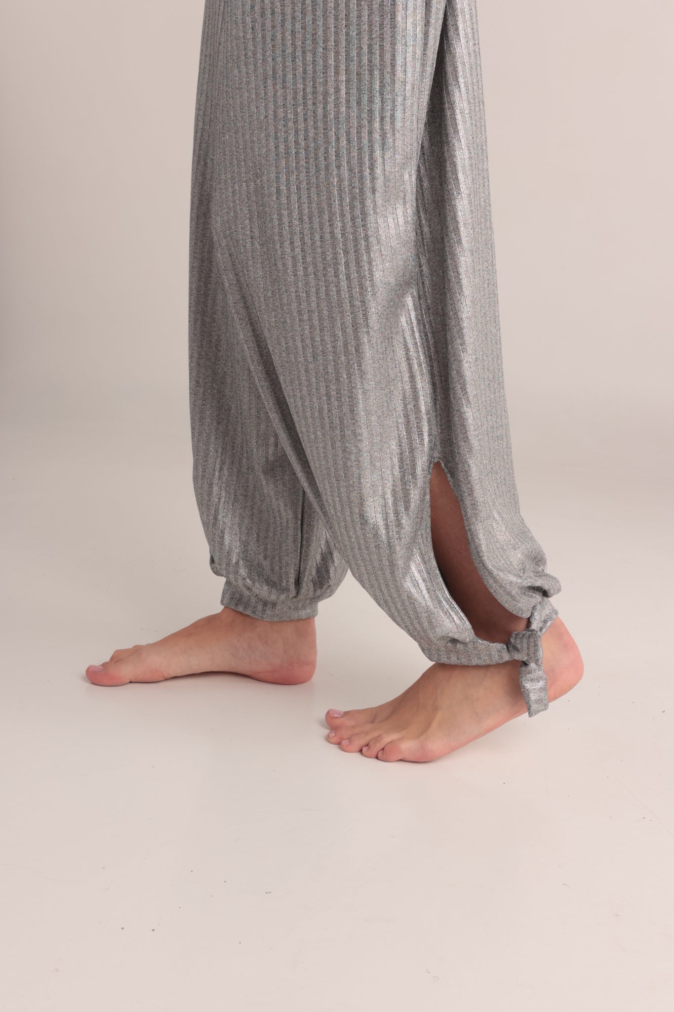 Este es un nuevo pantalon de corte asimetrico y de anudar en el tobillo , en un material tejido suave y de tacto frio .Esta  prenda es más que tela: es un recordatorio de que somos polvo de estrellas, de que el infinito no está afuera sino en lo profundo de tu interior. Al vestirlas, no solo te cubres de comodidad y belleza, también vistes la verdad cósmica de tu ser: eres universo en movimiento, eres constelación viva, eres luz encarnada.   . Color: Plata  Composicion: poliéster  Spandex